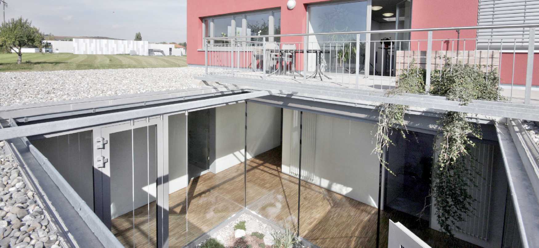Zur einfachen Orientierung für die Kunden wurde eine Sichtbetonwand durch das Gebäude geführt. Sie bildet das Gegenstück zum verglasten Innenhof und leitet den Patienten vom Windfang bis tief in den Behandlungstrakt. An ihr entlang staffeln sich die einzelnen Bereiche und ermöglichen so eine klare Struktur der Raumkonzeption.